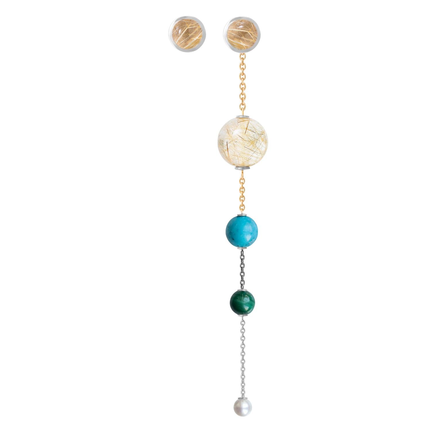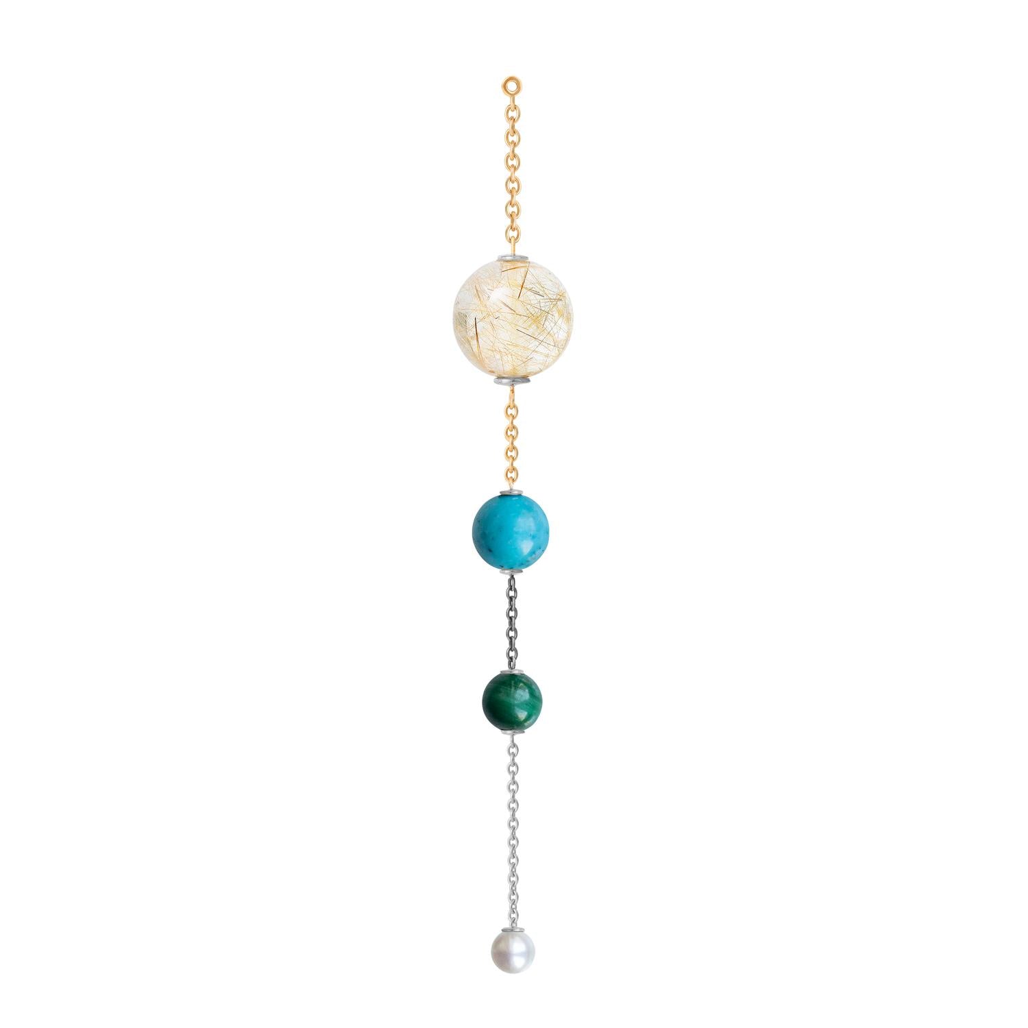 Lotus vedhæng til ørering i sterling sølv og 18 kt. rødguld med rutilkvarts, turkis, malakit og ferskvandsperle.