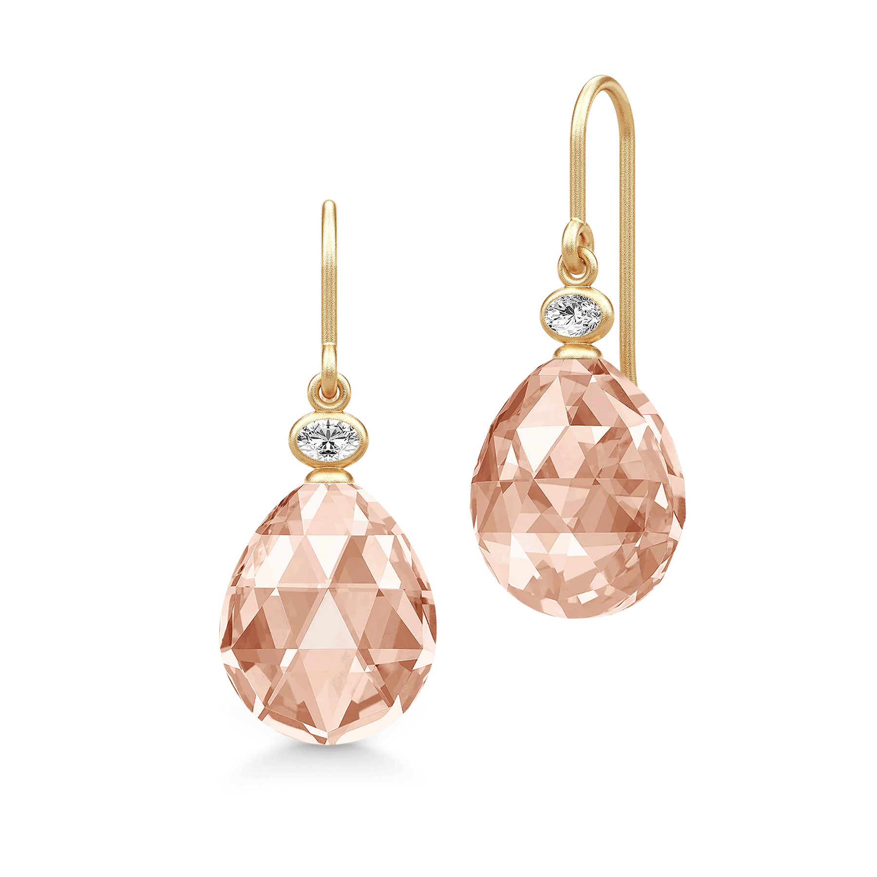 Ofelia øreringe med Peach Morganite sten. Hver ørering er prydet med en dråbeformet briolette med rose-cut og en ovalslibet hvid zirkonia – ansvarligt udvundet og håndsat med præcision.
